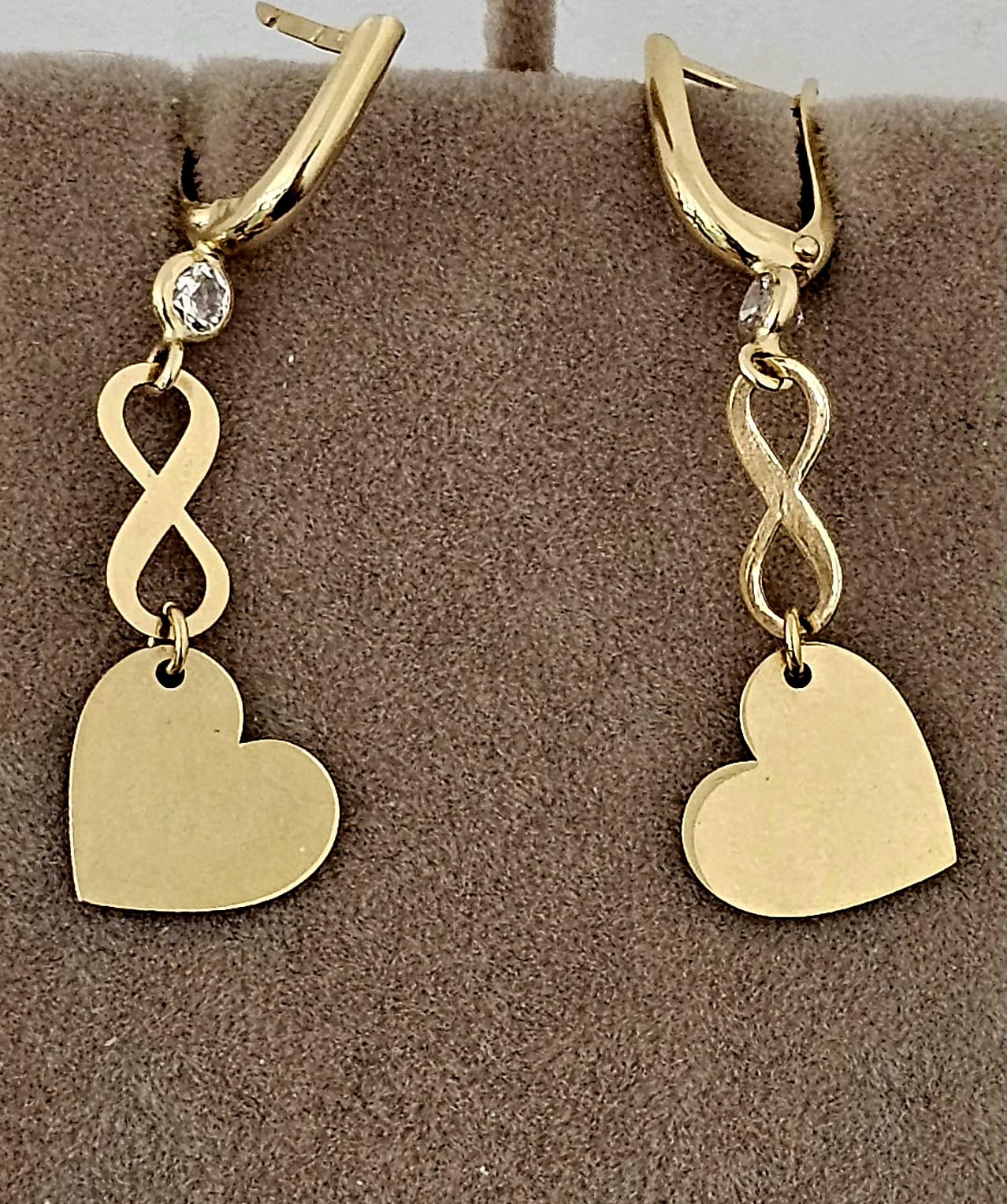 Acești cercei noi din aur galben 14K îmbină perfect simbolul infinitului cu o inimă simplă, oferind o bijuterie încărcată de semnificație. Un mic zirconiu adaugă strălucire discretă, iar designul lor fin îi face ideali pentru purtare zilnică sau pentru un cadou de suflet.