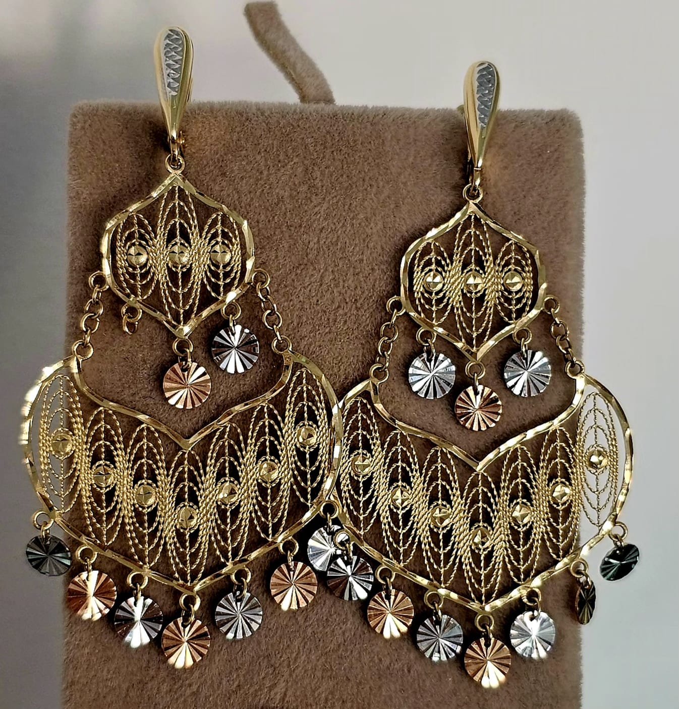 Acești cercei din aur galben 14K sunt o adevărată capodoperă artizanală. Realizați într-un stil oriental rafinat, cu detalii lucrate migălos și discuri mobile în nuanțe de aur galben, alb și roz, aceștia creează un efect spectaculos la fiecare mișcare. Ușori, dar vizual impunători, sunt alegerea ideală pentru evenimente, dar și pentru femeia care iubește să iasă în evidență.