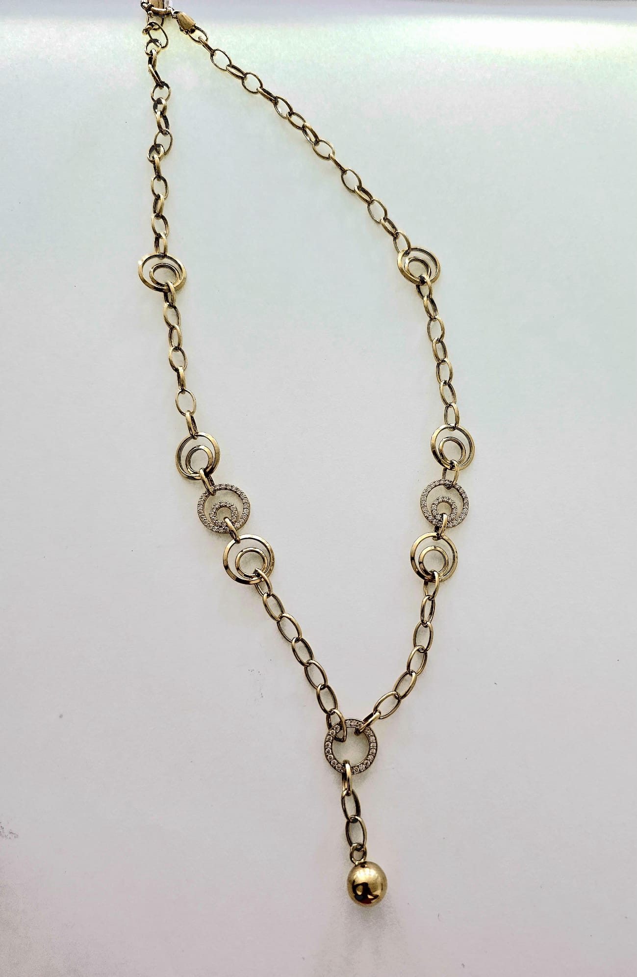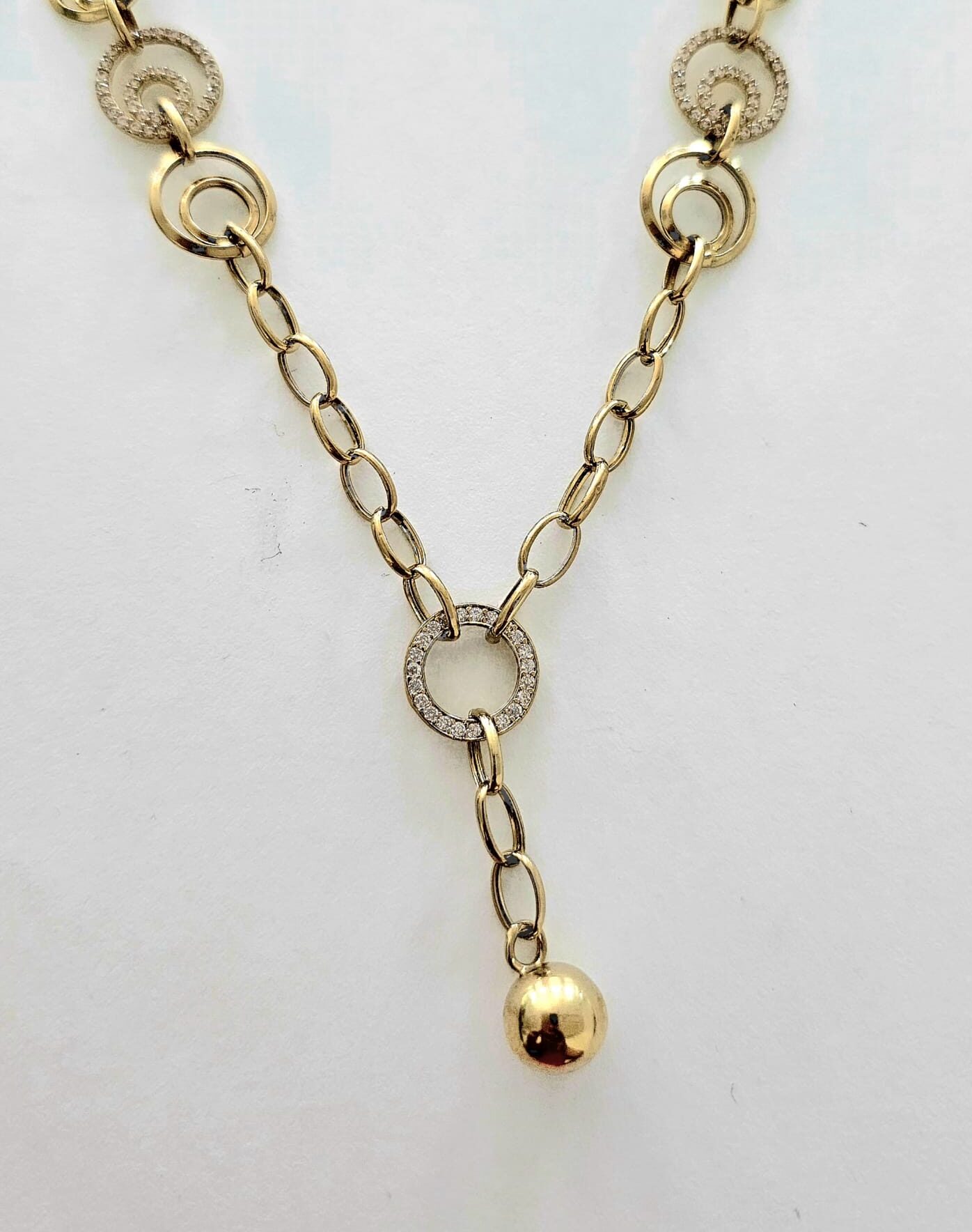 Răsfață-te cu o bijuterie care iese din tipare! Acest lanț din aur galben 14K combină armonios cercurile texturate cu zirconii strălucitoare și detaliile moderne, oferind un look sofisticat și magnetic. Finalul în formă de bilă aurie adaugă o notă jucăușă și elegantă, transformând fiecare apariție într-o declarație de stil.
